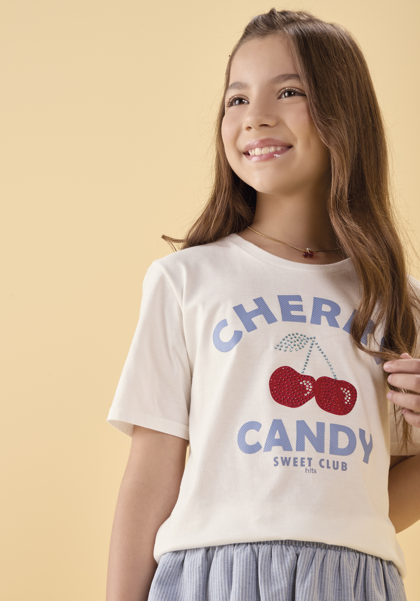 A blusa possui bordado delicado com aplicação de strass, adicionando um brilho sutil e encantador ao visual. Com comprimento regular, é perfeita para diversas ocasiões. A saia em tecido leve conta com babados que proporcionam movimento gracioso e um ar romântico ao look.