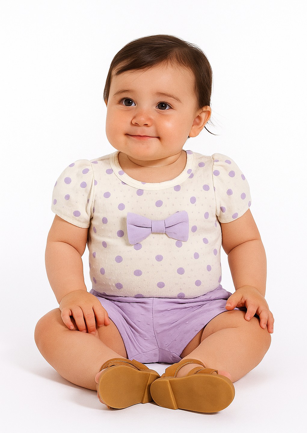 CONJUNTO INFANTIL MENINA COM SHORTS E BLUSA ESTAMPADA é a combinação perfeita entre charme e conforto para os dias de calor. A blusa, feita em malha com elastano e textura de poás, possui estampa delicada, prega central e laço aplicado, que criam um visual doce e encantador. As mangas curtas e o fechamento posterior por botão proporcionam praticidade e um caimento impecável.